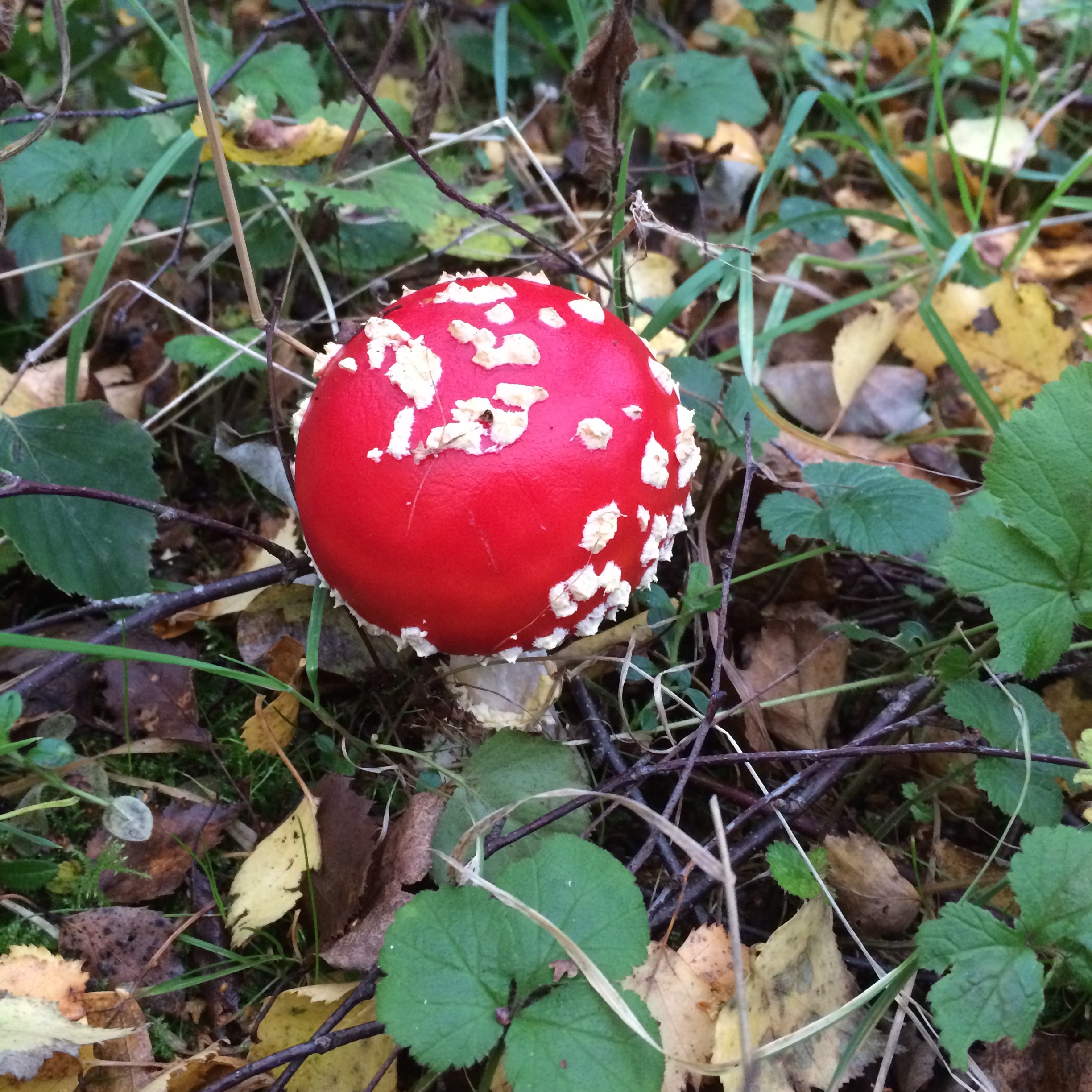 After hearing the poem I decided to venture out with the dogs for a nice Autumnal walk at Cothill Quarry. It was clear but windy, the tail end of hurricane Gonzalo, so we headed off towards the woods for a little shelter. I was thinking about an Instagram post I’d seen while having my morning cuppa tagged ‘thistimelastyear’ and felt sure it was around this time last year I had discovered the amazing red and white spotted mushrooms next to one of the paths. I headed in that direction determined that I would find them again. Once on the path I walked slowly, staring hard into the undergrowth. It wasn’t long until I caught a glimpse of red and backtracked to investigate. Sure enough it was Alice’s Magic Mushroom!