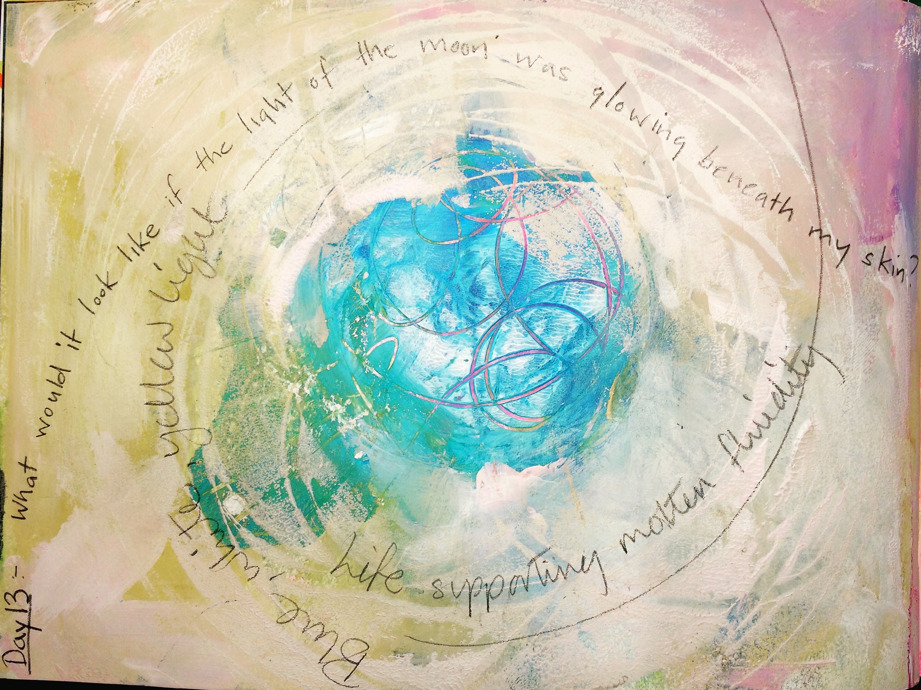 Day 13 – I was intrigued by the idea of today’s quote and wanted to see if I could express with paint how it would be to have the light of the moon glowing through my skin. It was a really powerful exercise actually and as I was slowly moving the paint around on the page, trying to capture the essence of the idea, I could absolutely feel the creative energy coursing through me, but with a serene vitality if that makes sense?