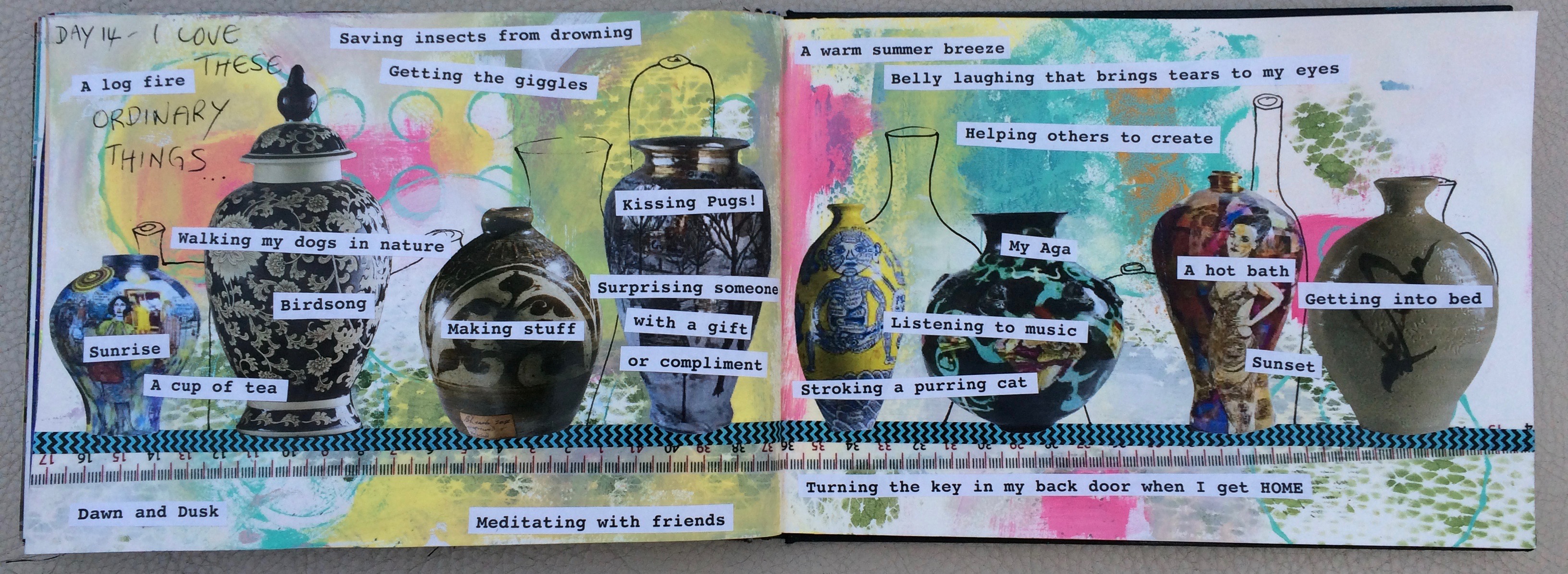 Day 14 – ‘I love these ordinary things…’ The thing I love about participating in these 30 day journal projects is that 30 days is not too long a time to commit to doing something daily, but yet the pace and intensity of having to show up in the journal each day and produce (or write) something can be truly revealing. Because there is no time to ponder and worry and pontificate, I just hand over the task to my higher self and trust the guidance I am given as to what should go on my page. Sometimes I sift through my collection of ready cutout images, or go to the computer and print an image that comes to mind, or feel the need to move paint around on the page. This morning I just started typing a list of all the simple things I treasure during my day. I probably could have kept on going but decided to stop at the things that came straight to mind with ease. I set them against a backdrop of pots on a shelf because I had this idea of how pottery is an ordinary everyday item that most of us have in our homes, and yet in the form of a vase it becomes somehow precious, often a container for sacred items. Pottery also offers us a timeline though history, particularly to date civilizations. And yet thousands of years later we still have the humble clay pot in common with those ancient people, who probably enjoyed the same simple daily pleasures that I do – I love that!